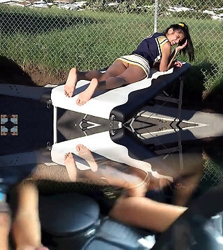 Cheerleader sans panties sunbathing on the massage table